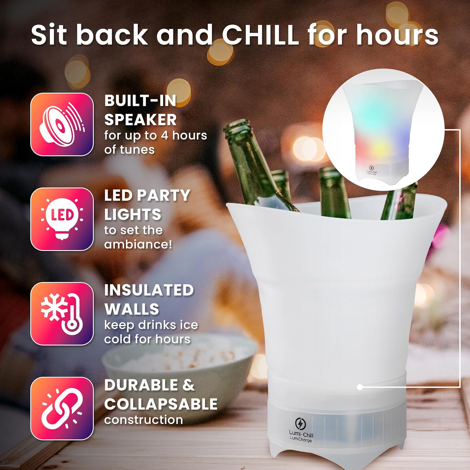 The Lumi-Chill by LumiCharge is the ultimate outdoor party accessory - a collapsible, waterproof ice bucket that cools your drinks while entertaining you. Designed for portability, it folds flat for easy transport to picnics, beach trips, or barb é cues. It features a built-in wireless speaker with up to 4 hours of playtime and vibrant multi-color LED lights that sync with your music, creating a dynamic party atmosphere wherever you go.